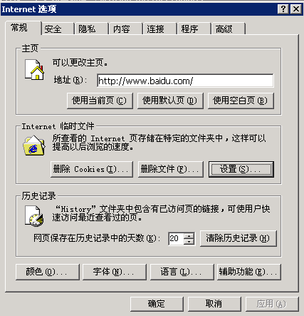 打开IE浏览器,点击“工具”下的“Internet设置”,在常规选项卡下,点击“Internet临时文件”一栏中的“设置”按钮