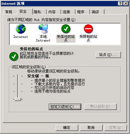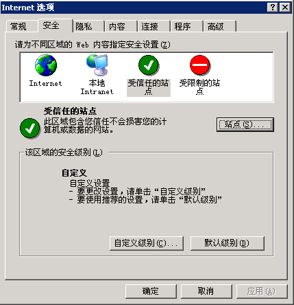1.点击“工具”下的“Internet设置”,在安全选项卡下,选择受信任的站点,点击“自定义级别”按钮